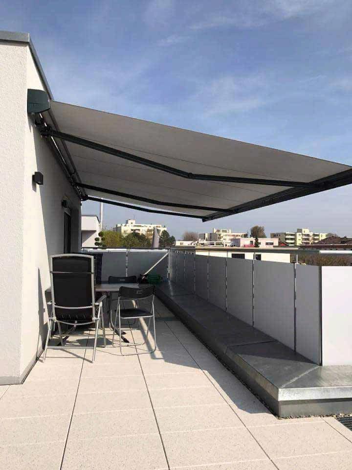 The high-quality awning system is specially designed to provide reliable shading for areas with large projection depths.