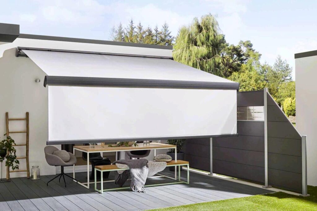 Folding-arm awnings are also ideal for smaller areas such as balconies, loggias, or patio niches. Thanks to the intelligent arrangement of the folding arms, even narrow designs can achieve generous projection depths, providing effective shade even in limited spaces.